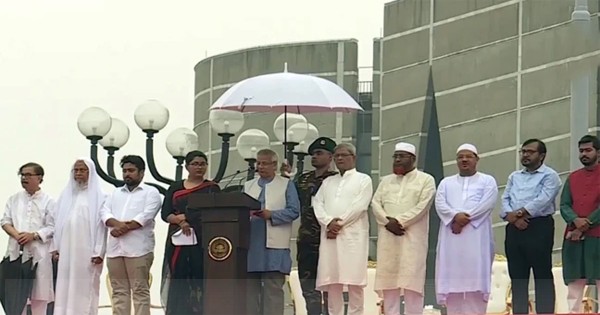 অনুষ্ঠান শুরু হয় জাতীয় সংগীত পরিবেশনের মাধ্যমে। প্রধান উপদেষ্টা তার বক্তব্যে বলেন, "আল্লাহ আমাদের জন্য রহমত বর্ষণ করছেন। এই রহমত নিয়েই আমি ঘোষণাপত্র পাঠ করছি।"