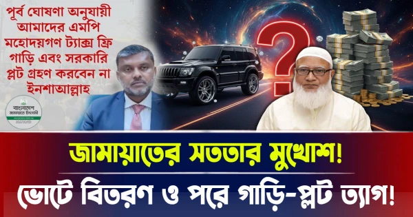 জনগণের মনে আজ বড় প্রশ্ন দেখা দিয়েছে, ট্যাক্স-ফ্রি গাড়ি না নেওয়াটা কি আসলেই সততা নাকি ভোট কেনার পাপ ঢাকার একটা পাতলা চাদর মাত্র? যে দলটির আদর্শিক ভিত্তি নিয়ে বারবার প্রশ্ন উঠেছে, তারা কেন এখন হঠাৎ করে এত বড় ত্যাগের অভিনয় করছে? আসলে জনসমর্থন হারানোর ভয়ে তারা এখন নতুন করে সততার জিকির তুলে টিকে থাকার চেষ্টা করছে। তবে বাংলাদেশের জনগণ এখন আর বোকা নেই, তারা ভালোভাবেই জানে কোন দল জনগণের সাথে প্রতারণা করছে।