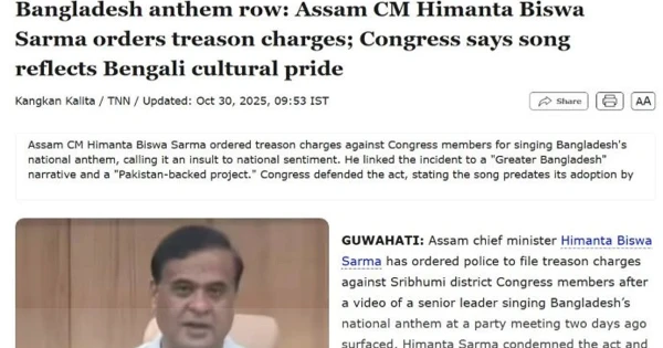 বাংলাদেশের জাতীয় সঙ্গীত ‘আমার সোনার বাংলা’ গাওয়া নিয়ে আসামের রাজনীতিতে তীব্র বিতর্কের ঝড় উঠেছে। কংগ্রেসের এক সভায় এই গান পরিবেশনের ঘটনায় রাজ্যজুড়ে শুরু হয়েছে উত্তেজনা। এর জেরে আসামের মুখ্যমন্ত্রী হিমন্ত বিশ্ব শর্মা বুধবার (২৯ অক্টোবর) নির্দেশ দিয়েছেন—এই ঘটনায় জড়িত কংগ্রেসের কয়েকজন সদস্যের বিরুদ্ধে রাষ্ট্রদ্রোহ মামলা করা হবে।