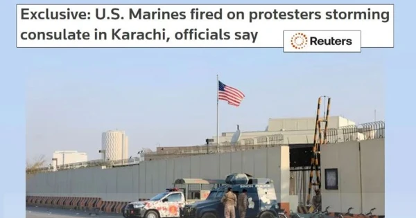 পাকিস্তানের করাচিতে অবস্থিত মার্কিন কনস্যুলেটে হামলার ঘটনায় যুক্তরাষ্ট্রের মেরিন সেনারা বিক্ষোভকারীদের লক্ষ্য করে গুলি চালিয়েছে বলে এক প্রতিবেদনে জানিয়েছে বার্তাসংস্থা রয়টার্স। দুই মার্কিন কর্মকর্তার বরাত দিয়ে প্রতিবেদনে বলা হয়, এই প্রথমবারের মতো নিশ্চিত হওয়া গেল যে ওই দিনের বিশৃঙ্খল পরিস্থিতিতে মার্কিন মেরিন সেনারা সরাসরি গুলি বর্ষণে জড়িত ছিল ।