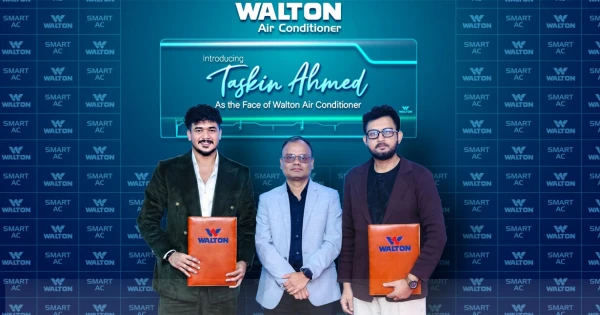 এ বিষয়ে রোববার (১৮ জানুয়ারি, ২০২৬) দুপুরে রাজধানীর বসুন্ধরায় ওয়ালটন করপোরেট অফিসে আয়োজিত এক আড়ম্বরপূর্ণ অনুষ্ঠানে ওয়ালটন এসি’র সঙ্গে চুক্তি স্বাক্ষর করেন তাসকিন আহমেদ। চুক্তিতে ওয়ালটনের পক্ষে স্বাক্ষর করেন সিনিয়র এক্সিকিউটিভ ডিরেক্টর ও জনপ্রিয় চিত্রনায়ক আমিন খান।