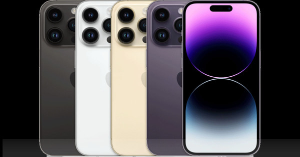 The iPhone 14 Pro showcases a premium stainless steel frame with a matte glass back, offering a luxurious and durable feel. Available in Space Black, Silver, Gold, and Deep Purple, it provides an elegant aesthetic.