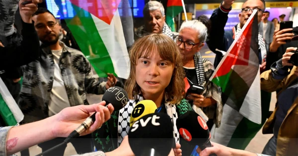 বাংলাদেশ সময় সোমবার রাত পৌনে ১০টার দিকে থুনবার্গ যখন এথেন্সের এলিফথেরিওস ভেনিজেলোস বিমানবন্দরে নামেন, তখন তার সমর্থকেরা ফুল দিয়ে তাকে স্বাগত জানান। তাদের হাতে ছিল ফিলিস্তিনের পতাকা, মুখে ইসরায়েলবিরোধী স্লোগান।