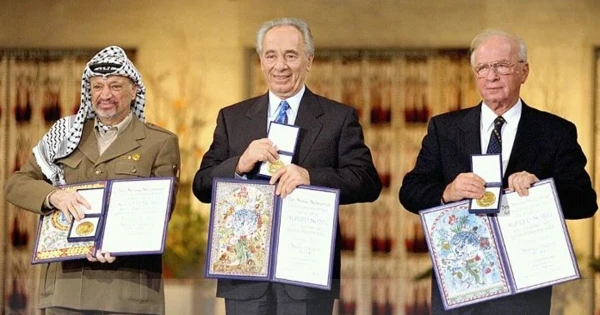 ১৯৯৪ সালে শান্তিতে নোবেল পুরস্কার যৌথভাবে পান ইসরায়েলের প্রধানমন্ত্রী আইজ্যাক রবিন, পররাষ্ট্রমন্ত্রী শিমন পেরেস এবং ফিলিস্তিনি মুক্তি সংস্থার (পিএলও) চেয়ারম্যান ইয়াসির আরাফাত।