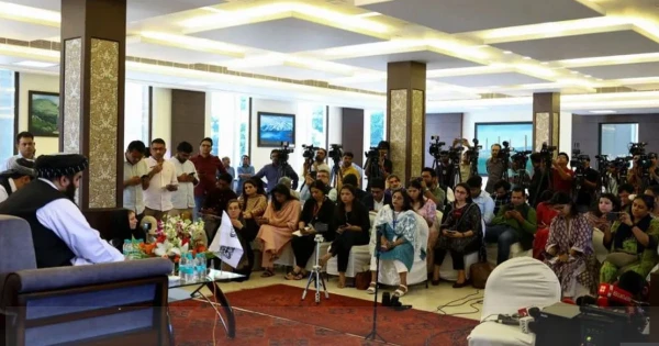 দিল্লিতে আয়োজিত আফগান তালেবান সরকারের এক সংবাদ সম্মেলনে ইতিহাস সৃষ্টি হলো এক ছবিতে — সামনের সারিতে বসে আছেন ভারতীয় নারী সাংবাদিকরা, আর তাদের সামনেই বক্তব্য দিচ্ছেন তালেবান পররাষ্ট্রমন্ত্রী আমির খান মুত্তাকি।