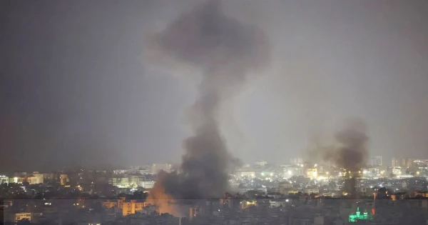১৩ মার্চ, ২০২৬; দক্ষিণ লেবাননের আব্বাসিয়া গ্রামে ইসরায়েলি বিমান হামলার পর ধোঁয়া ওঠা ভবন।