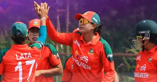 এশিয়া কাপ রাইজিং স্টারসে দুর্দান্ত ছন্দে থাকা বাংলাদেশের মেয়েরা আরেকটি বড় জয়ের মাধ্যমে পৌঁছে গেল ফাইনালে। সেমিফাইনালে পাকিস্তান ‘এ’ দলকে ৫৪ রানের বিশাল ব্যবধানে হারিয়ে শিরোপার লড়াই নিশ্চিত করেছে ফাহিমা খাতুনের নেতৃত্বাধীন বাংলাদেশ ‘এ’ দল।