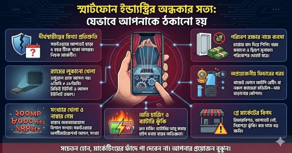 আপনি যে স্মার্টফোনটি হাতে ধরে আছেন—জানেন কি, সেটি তৈরি করার আগেই ঠিক করে নেওয়া হয়েছিল কিভাবে আপনাকে ঠকানো হবে? প্রতিবেদনে জানবেন সেই অন্ধকার ইন্ডাস্ট্রির পর্দার পেছনের সব আসল সত্য—যা ব্র্যান্ডগুলো চাইলেও আপনাকে জানাতে চায় না। আপনার ফোন কেনার সিদ্ধান্ত বদলে যেতে পারে।